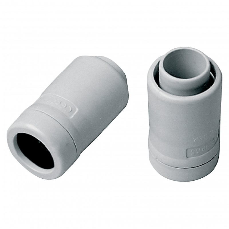 Raccordo per la connessione tra un tubo e una guaina spiralata con identico diametro realizzato in tecnopolimero antiurto a base di PVC rigido. Anello interno morbido di tenuta per compensazione delle tolleranze sui tubi. Grado di protezione IP67. Grado di autoestinguenza V0 secondo la norma UL94. Resistenza al calore anomalo (GWT IEC 60695-2-11): fino a 960 °C. Prodotto in conformità alla norme EN 61386-1, EN 61386-21.