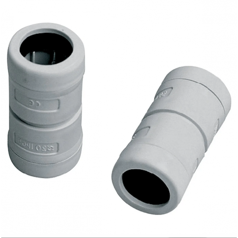 Manicotto per la connessione tra due tubi con identico diametro realizzato in tecnopolimero antiurto a base di PVC rigido. Anello interno morbido di tenuta per compensazione delle tolleranze sui tubi. Grado di protezione IP67. Grado di autoestinguenza V0 secondo la norma UL94. Resistenza al calore anomalo (GWT IEC 60695-2-11): fino a 960 °C. Prodotto in conformità alla norme EN 61386-1, EN 61386-21.