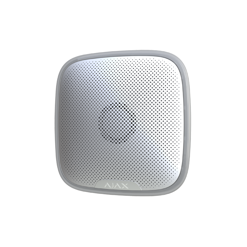 Il dispositivo è dotato di un grado di protezione IP54, contro la polvere e l'umidità. Se necessario, si può connettere a un alimentatore esterno da 12 V CC. In caso di tentativo di rimozione della sirena, l'accelerometro integrato innesca un allarme.
