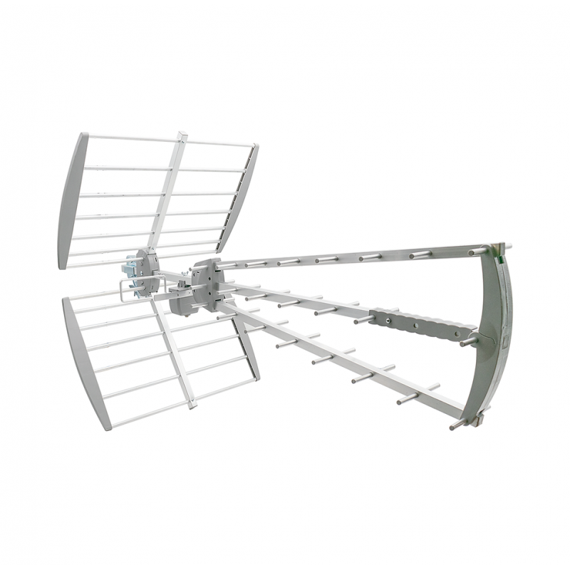 Antenna TV terrestre banda UHF in alluminio con connettore tipo F, 26 elementi su 3 culle, riflettori a griglia. Range di frequenza 470~694 MHz, guadagno 11-16 dB, rapporto avanti-indietro 16-26 dB, Ch. 21÷48, attacco su palo.