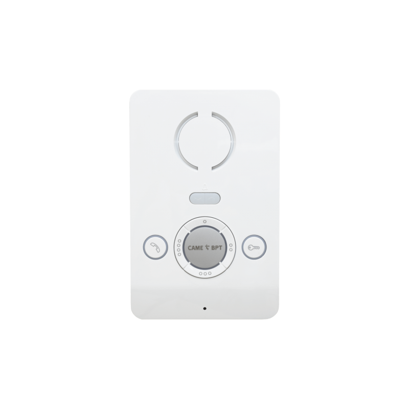 Citofono vivavoce, 2 tasti AUX programmabili e colore bianco.Citofono a parete caratterizzato dai 2 tasti principali che permettono l'apertura porta e l'attivazione della comunicazione e dalla ghiera centrale che permette di gestire 2 comandi ausiliari e 2 chiamate Intercom. Dotato di pulsanti per la regolazione/esclusione della suoneria. È inclusa la staffa per l'installazione a parete su scatola 503 (verticale) e su scatola tonda Ø 60 mm. Compatibile con sistema X1 e XIP.