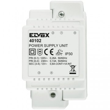 Contenitore in materiale plastico per l'installazione in quadri elettrici (EN50022) e dimensione 12 moduli DIN basso. Scheda elettronica completa per la gestione di posti esterni videocitofonici (18 V DC - 1100 mA max) e per la gestione della montante videocitofonica (20 V DC - 800 mA max) con protezione elettronica da sovraccarichi o cortocircuiti.