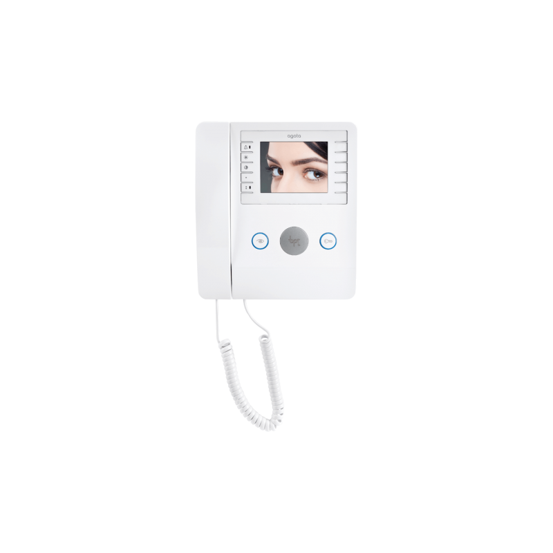 Videocitofono a cornetta, display LCD da 3,5”, 2 tasti AUX programmabili e colore bianco.Monitor a parete con display LCD a colori da 3,5˝. Sul lato sinistro si trovano i tasti di regolazione/esclusione suoneria, regolazione saturazione colore e luminosità e i 2 tasti ausiliari. Ben visibili e retroilluminati sono i tasti principali che permettono l'apertura porta e l'autoinserimento video dei posti esterni. È dotato di funzione Master/Slave e della funzione palleggio video fra derivati in chiamata contemporanea. È inclusa la staffa per l'installazione a parete su scatola 503 (orizzontale o verticale), scatola 506E e su scatola tonda Ø 60 mm. Compatibile con sistema X1 e XIP.