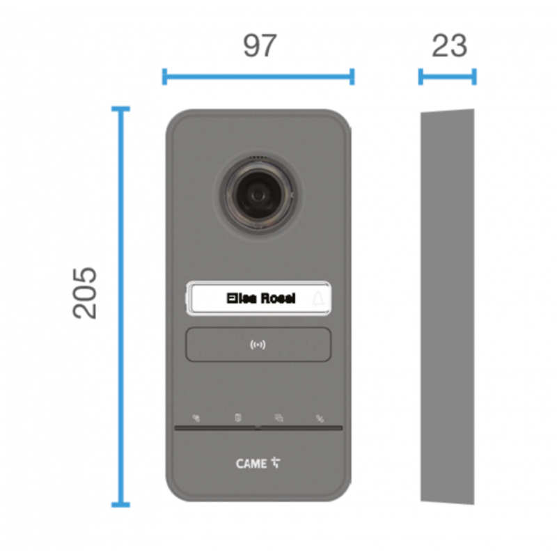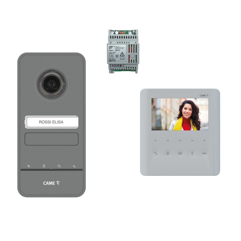 Kit videocitofonico monofamiliare composto da posto esterno LHS V/01 con pulsante singolo di chiamata, videocitofono vivavoce PLX V con display LCD da 5”, e alimentatore VAS/101.