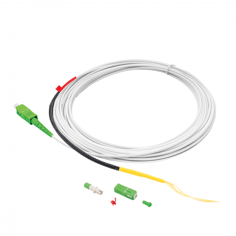Bretella ottica monofibra di tipo monomodale, guaina sbucciabile tool-less LSZH 2,6 mm, uso interno con riempitivo in filati aramidici (kevlar), classe di reazione al fuoco Eca, con connettore SC/APC da un lato e connettore sistema Easy Fiber dall'altro. Dotata di calza intrecciata di protezione in nylon. Diametro massimo testa sistema di traino 3,5 mm.