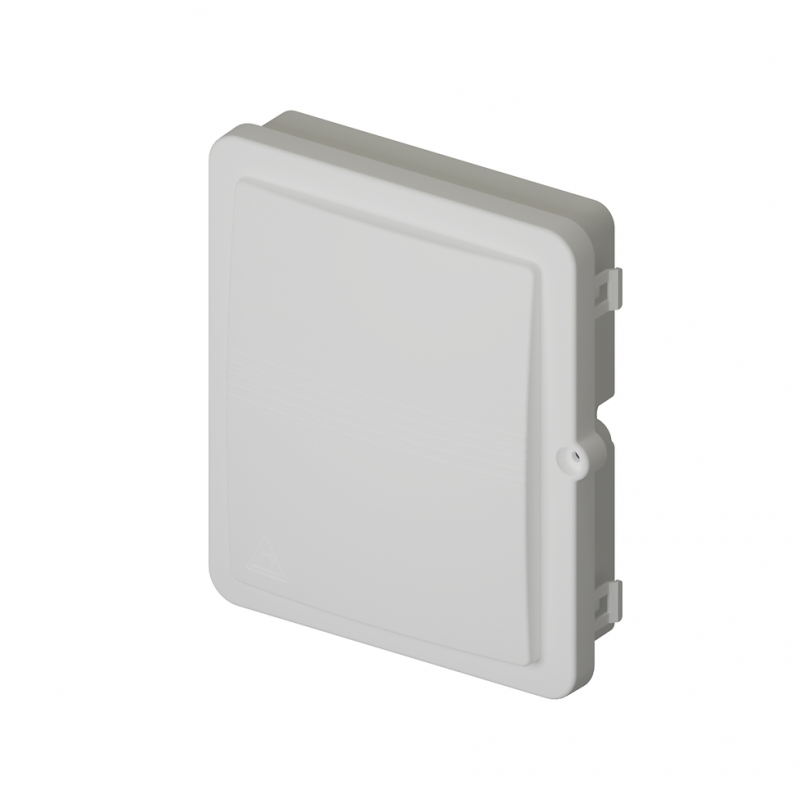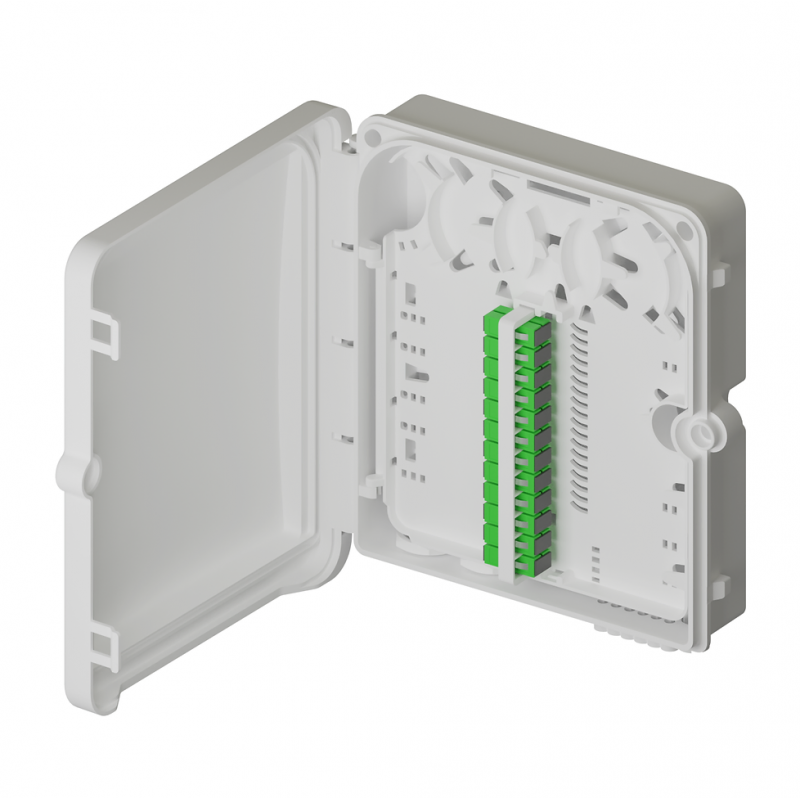 Contenitore in materiale plastico con sportello apribile a 180° e chiusura protetta da serratura, dispone di 2 ingressi cavi per dorsali, 12 uscite per fibre ottiche, cassetto portagiunti a libro, guide interne per la gestione delle scorte in fibra, con possibilità di alloggiare fino a 12 bussole SC/APC (viene fornito con 8 bussole SC/APC).
