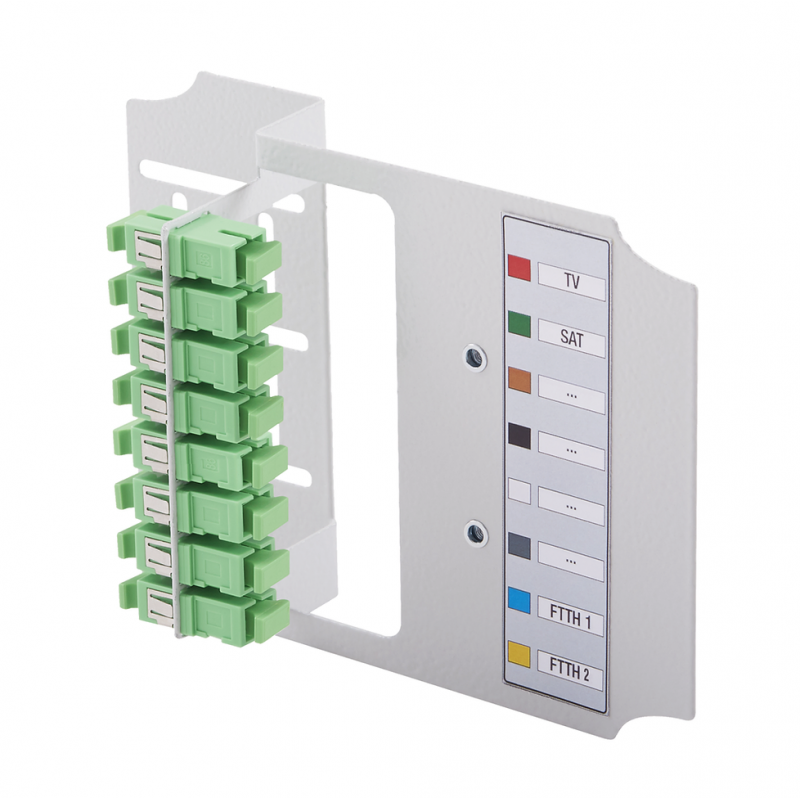 Scheda per le Terminazioni Ottiche di Appartamento e di Montante da incasso per scatola PT6 in lamiera zincata e verniciata a polveri. La STOA è predisposta per l'alloggiamento di massimo 8 bussole SC/APC ed è dotata di 4 bussole SC/APC e viti di fissaggio. La STOA può essere montata sul fondo di cassette di derivazione da incasso per pareti in muratura, per pareti leggere e cartongesso o per montaggio in scatole da parete.