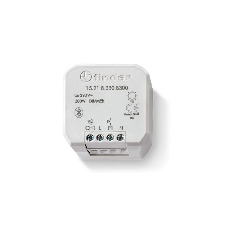 Dimmer elettronico Bluetooth YESLY Tipo 15.21 con protocollo di trasmissione Bluetooth 4.2 Low Energy. Connessione crittografata a 128 bit. Dispositivo programmabile tramite App Finder TOOLBOX compatibile con sistemi operativi iOS e Android. Può essere collegato a pulsanti filari o a pulsanti wireless BEYON e Tipo 013B9. Potenza massima dimmerabile 300 W. LED di segnalazione di stato. Montaggio da incasso (es. scatola tonda Ø 60 mm).