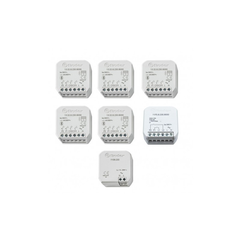 KIT Automazione Tapparelle Finder YESLY è composto da: 5 Attuatori per tapparelle Bluetooth Finder YESLY (codice 13S28230B000) 1 Interfaccia Finder Yesly (codice 1YE8230) 1 Ripetitore Bluetooth Finder YESLY RANGE EXTENDER (codice 1YE8230).