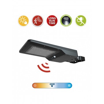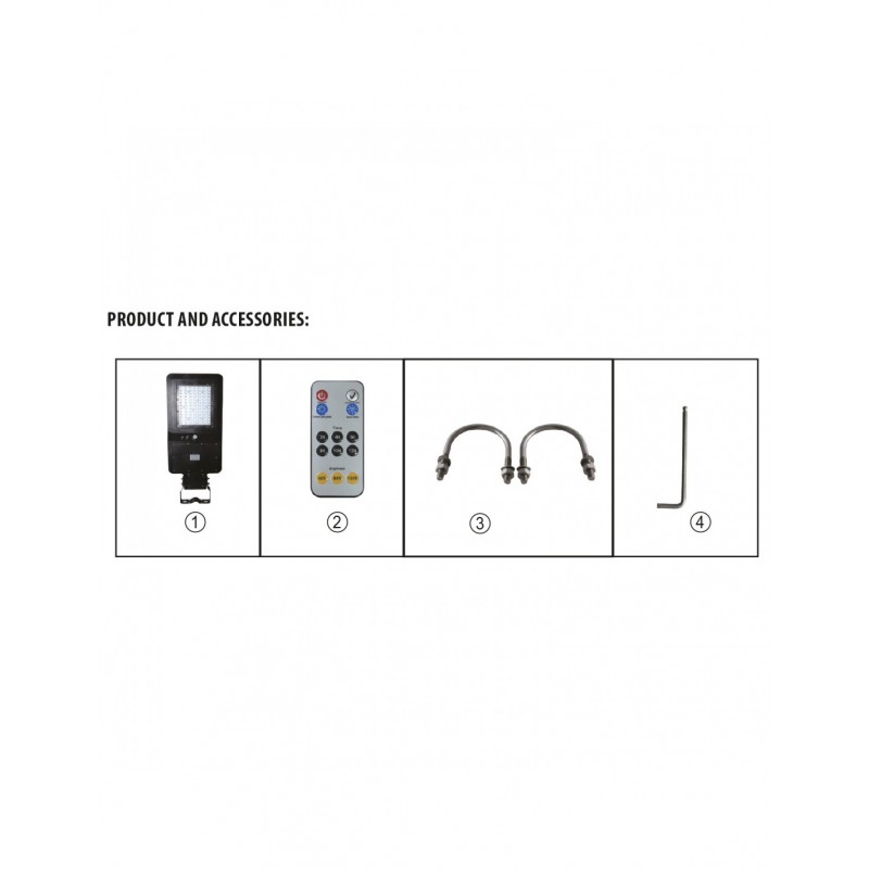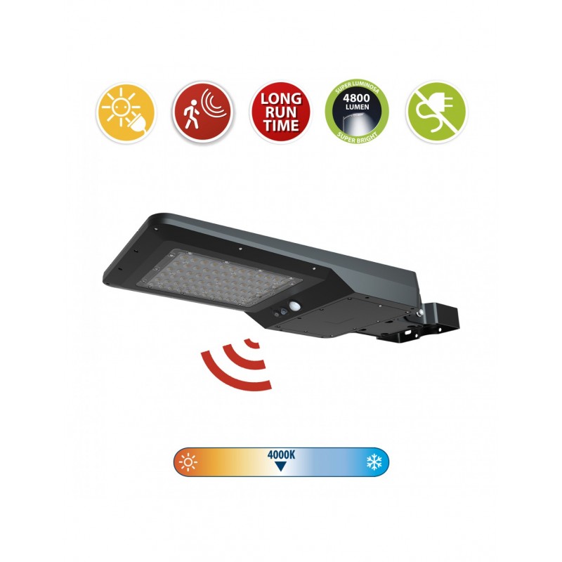 Ultra luminoso: Il lampione solare da 40W è munito di 90 LED SMD che forniscono un'illuminazione super brillante per un'area esterna di circa 80m². Installabile a palo oppure da fissare al muro, questa potente luce solare per esterni vi garantisce 4800 lumen. La batteria al litio di grande capacità da 12000mAh garantisce lunga autonomia, anche per le giornate senza sole. Tecnologia di ricarica intelligente: Il pannello solare integrato converte la luce solare in elettricità con alta efficienza (21W monocristallino). Il sistema di ricarica di ultima generazione rende il pannello solare ricaricabile anche in giornate nuvolose o piovose. Illuminazione garantita per 365 giorni l'anno. Con sensore di movimento: il lampione si carica durante il giorno e si accende automaticamente di notte. Modalità di funzionamento: 1) Modalità illuminazione costante: la lampada si accenderà automaticamente di notte e manterrà costantemente il 60% di luminosità per 4 ore, quindi passa alla modalità sensore di movimento. 2) Modalità sensore di movimento: la lampada si accenderà automaticamente al 100% della luminosità quando viene rilevato un movimento in un raggio ≤ 12 metri, poi si abbasserà al 30% della luminosità dopo 20 secondi senza movimento. Luce versatile per esterni: la lampada è stata concepita per stare all'esterno. E' dunque resistente all'acqua (certificata IP65), agli UV e agli agenti atmosferici (policarbonato iper resistente). La luce stradale funziona tra -15 e +50 gradi. Resiste a condizioni meteorologiche estreme, come fulmini, pioggia, neve. Perfetta per giardino, patio, cortile, garage, piazzola, parcheggio, azienda, ecc. Facile da installare: Questa luce solare per esterni è facile da installare. Non serve portare un cavo elettrico, fare trincee etc... è totalmente senza fili. Ed è anche un bel risparmio: 0 euro in bolletta! Può essere montata a parete o a palo (diritto o curvo), l'altezza di installazione consigliata è di circa 3-5 metri. Munita di comodo telecomando per comandarla e programmarla.