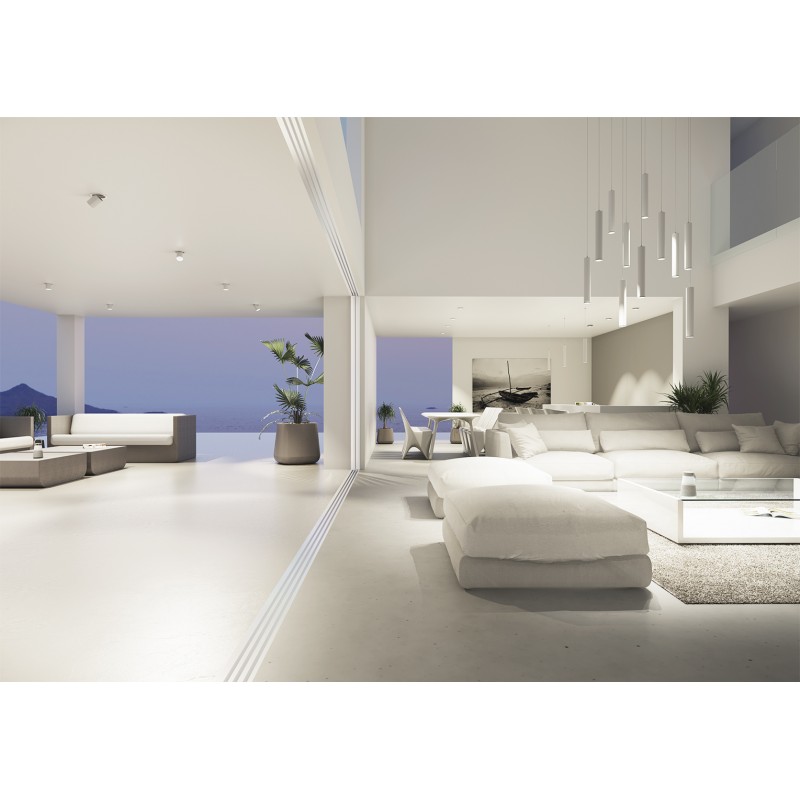 Atmos è un faretto decorativo a sospensione per interni con portalampada GU10. Estruso in alluminio con finiture bianco o nero opaco e con rosone incassato e in superficie.