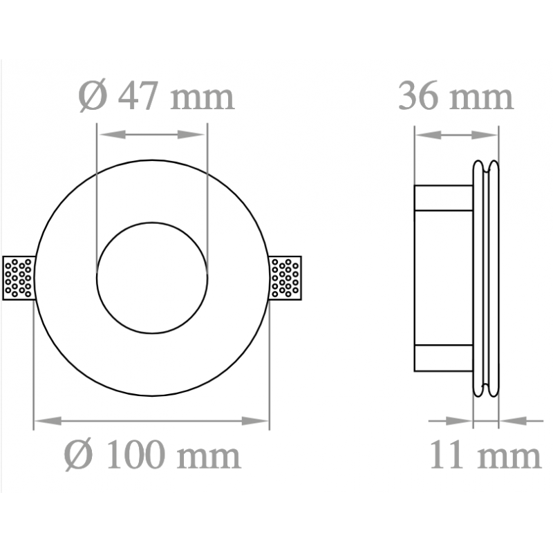 Faretto da incasso in gesso con svasatura e spessore ridotto H 36 mm, da integrare nel cartongesso per dare omogeneità tra soffitto e corpo illuminante.