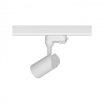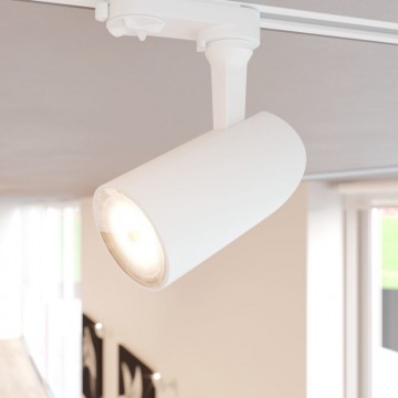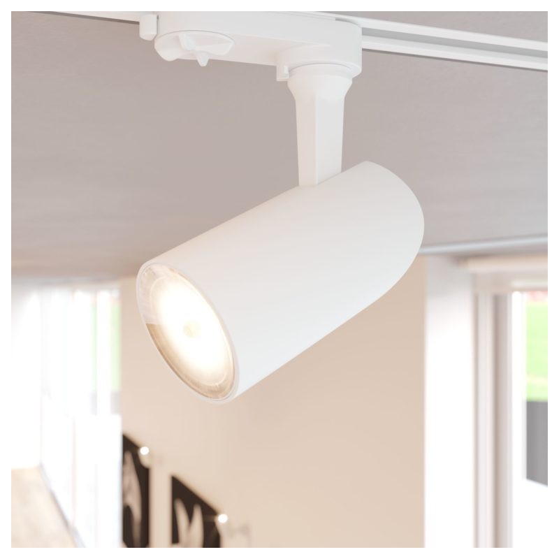 Proiettore a LED da binario, orientabile, disponibile nelle finiture bianco e nero opaco. Dotato di attacco per inserire una lampadina GU10, può essere utilizzato in diversi ambienti a seconda della lampadina che viene utilizzata.