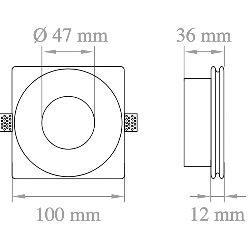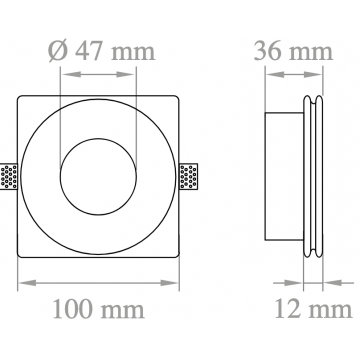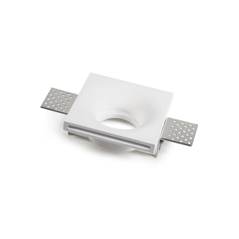 Faretto da incasso in gesso con svasatura e spessore ridotto H 36 mm, da integrare nel cartongesso per dare omogeneità tra soffitto e corpo illuminante.