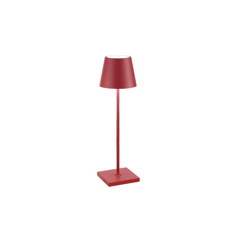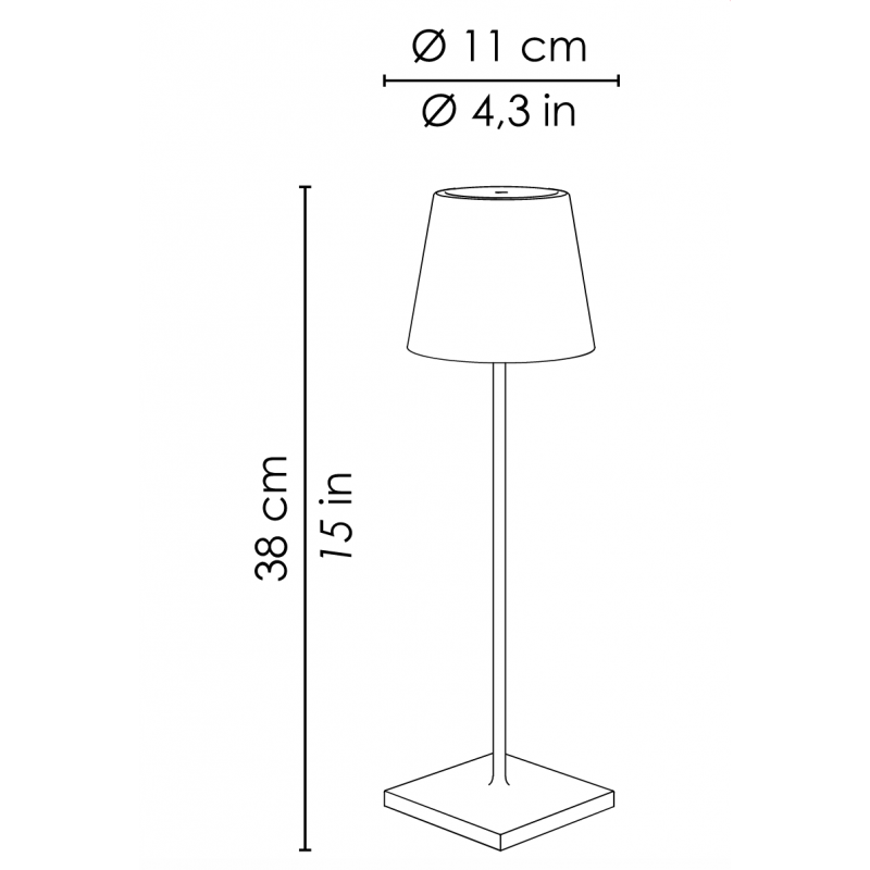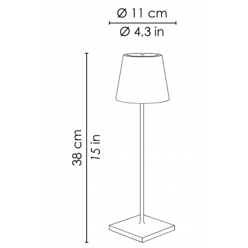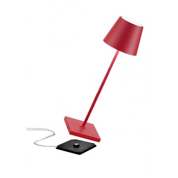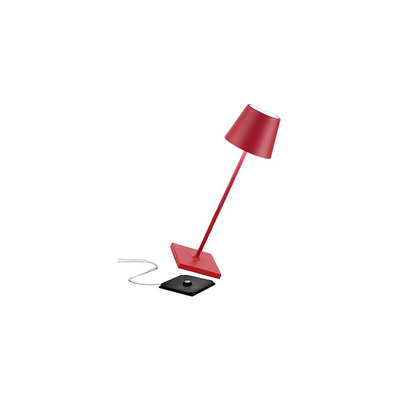 Lampada ricaricabile da tavolo, compresa di base di ricarica a contatto, con corpo in alluminio verniciato, diffusore in policarbonato e fonte luminosa a LED.