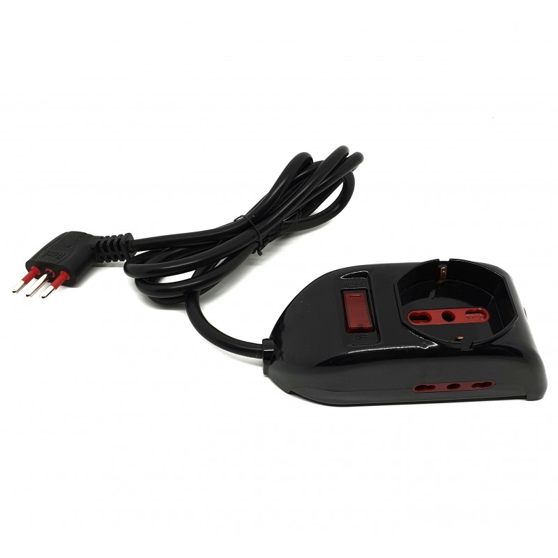 Multipresa nera 1 Schuko 2 Bivalenti con spina a pipa 10A e protezione da sovracorente Rosi