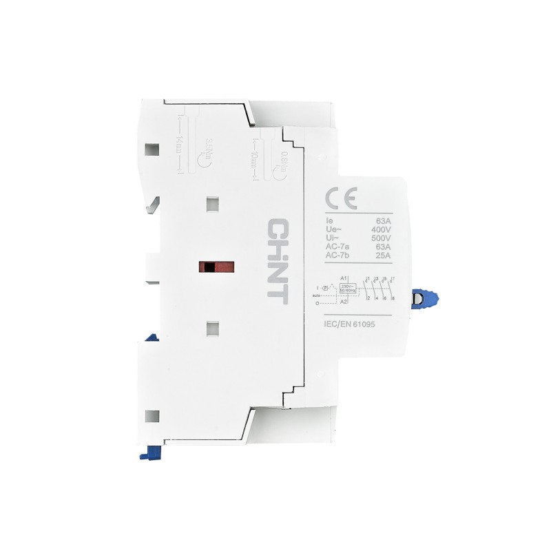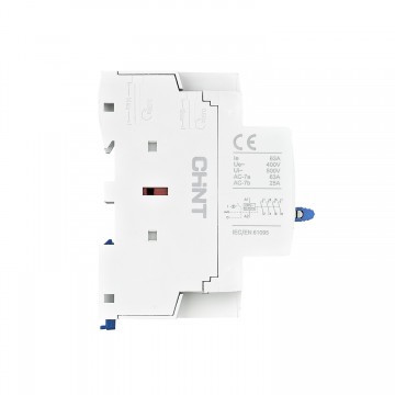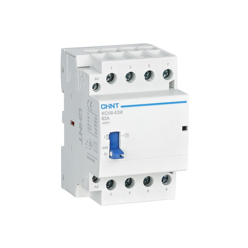 Contattori modulari serie NCH8 per utenze o complessi residenziali e industriali. Disponibili in versione bipolare e quadripolare, da 1 a 3 moduli DIN, con corrente nominale (In) da 20 a 63 A e tensione nominale 230 e 400 V. Contatti ausiliari 2NA, 4NA, 1NA+1NC, 2NA+2NC. Tensione bobina 230 V e 24 V. Versione bipolare da abbinare con distanziatori (in dotazione).
