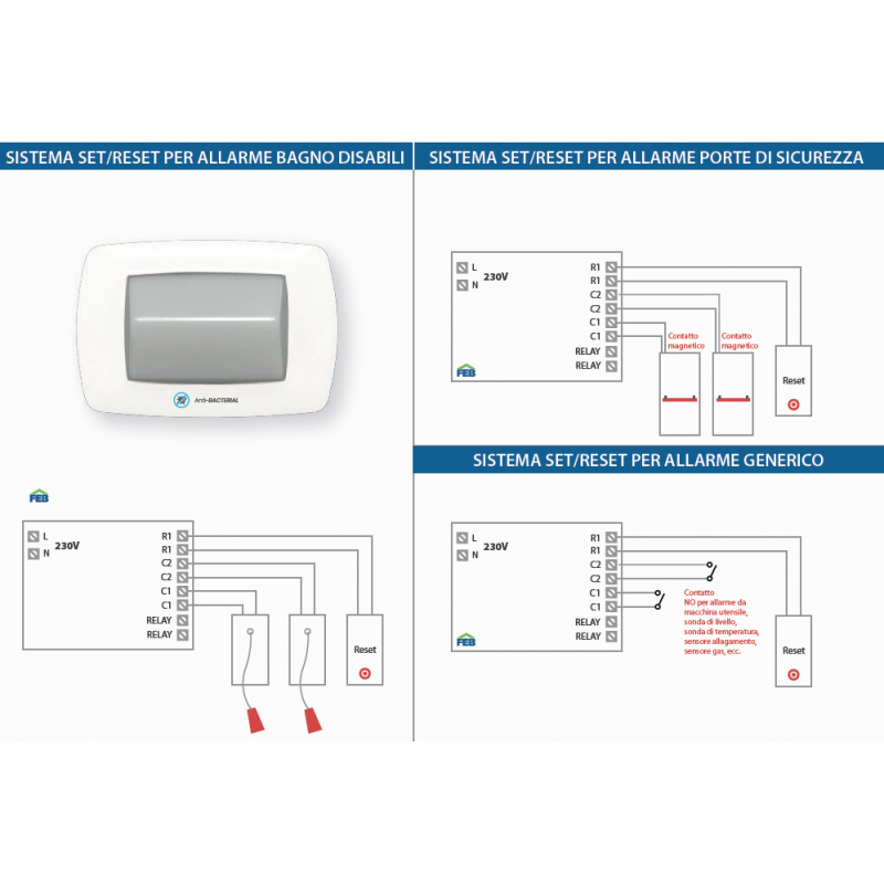 Attiva la segnalazione ottica e acustica in seguito alla chiusura di uno dei due ingressi di chiamata e la disabilita in seguito alla chiusura del contatto di reset.