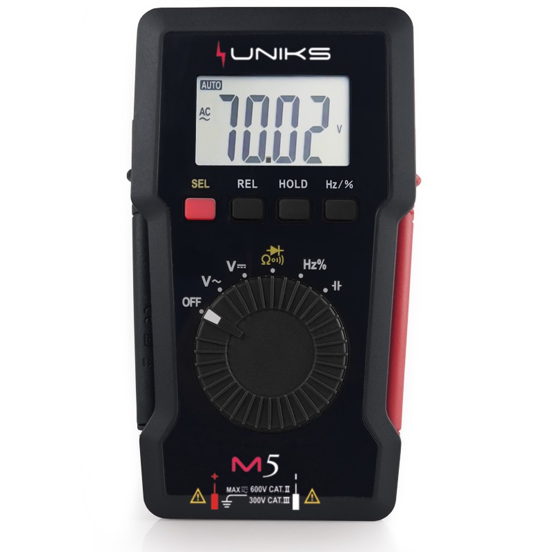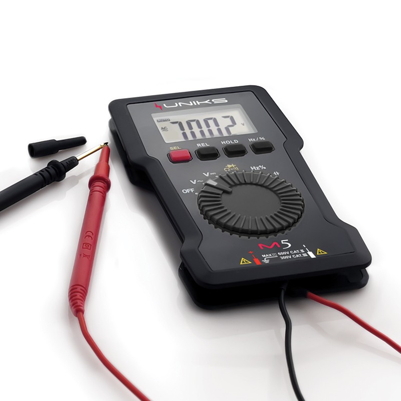 UNIKS M5 è il multimetro digitale tascabile di semplice utilizzo grazie i puntali di misura integrati ed avvolgibili.