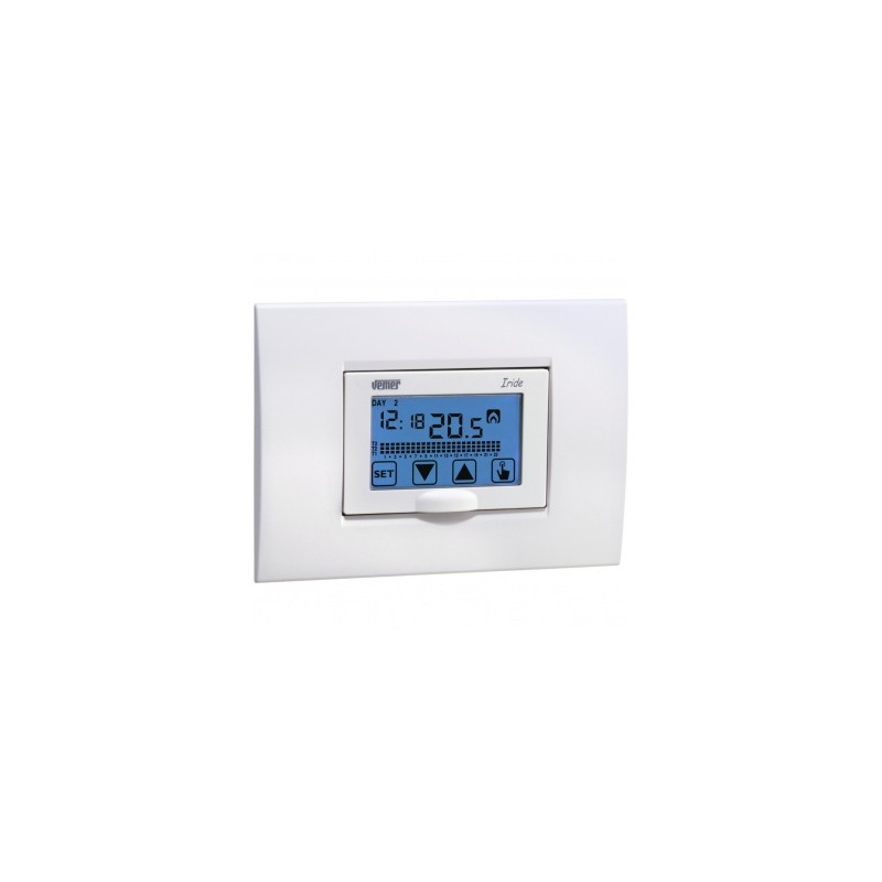 Cronotermostato touch screen da incasso con programmazione settimanale e alimentazione a batterie. La tastiera touch screen è rappresentata da 4 icone che, unita al display con retroilluminazione di colore blu (attiva al tocco di un tasto), garantisce al prodotto eleganza e sobrietà. La funzione “blocco tastiera” con password, utile ad esempio per installazioni in luoghi pubblici, impedisce modifiche delle impostazioni a persone non autorizzate. L’ingresso digitale consente il collegamento di un combinatore telefonico per l’accensione o lo spegnimento a distanza. Il prodotto viene fornito con i telaietti che consentono l’adattamento alle placche delle principali serie civili e i frontalini di colore bianco